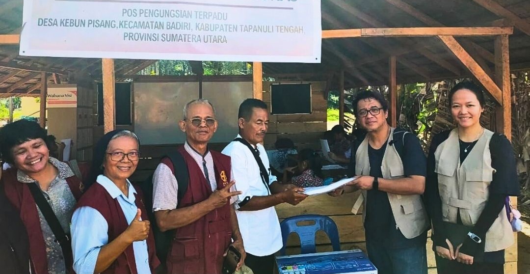Penyerahan bantuan dari jaringan Caritas Indonesia untuk Sekolah Darurat di Pos Pengungsian Kebun Pisang, Tapanuli Tengah. Dok. Caritas Indonesia